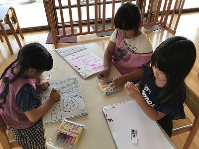 「書いてみたい!」とめろんぐみさんは自分やお友だちの名前カードを見ながら、漢字を書いていました。