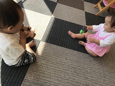 タイヤのついたおもちゃでお友だちと一緒に遊びました。おもちゃが転がるとお友だちと顔を見合わせて楽しそうに笑っていました。