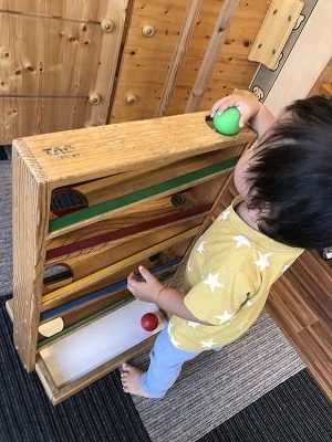 ボールを穴にいれ転がる様子を見て手を叩き楽しそうに遊んでいました。途中から緑色のボールは手から離さず、赤色のボールを転がし続けていました。