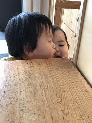 机にお友だちと一緒につかまり立ちをし「ばあ!」と声が聞こえてきました。机の下に顔を隠して仲良くいないいないばあをして遊んでいました。