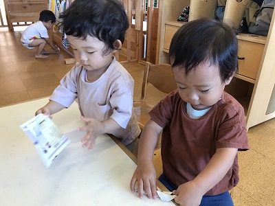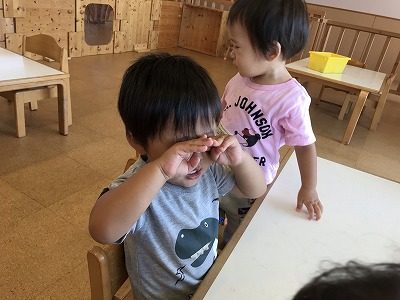 折り紙や玩具から「まる!」「これは、さんかく!」とたくさんの形についての声が聞こえてきていました。折り紙を何度も何度も折っていき、小さな四角が出来たお友だちからは、「しかく、いっぱいできた!」と折ったことでたくさんの四角を作ったようで、嬉しそうに周りのお友だちに教える姿がありました。また折り紙を丸めて筒状にしたものが出来上がったお友だち。「あ!〇〇ちゃん!」「まんまんまどから、のぞいたら~♪〇〇ちゃーん!」と筒の中を覗いて反対側にいるお友だちと目が合うと、にっこりと笑い合う、とても微笑ましい場面がありました。