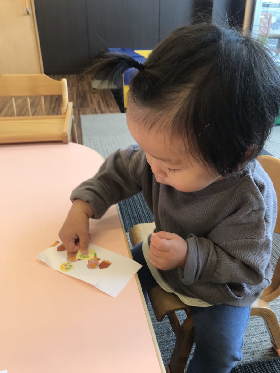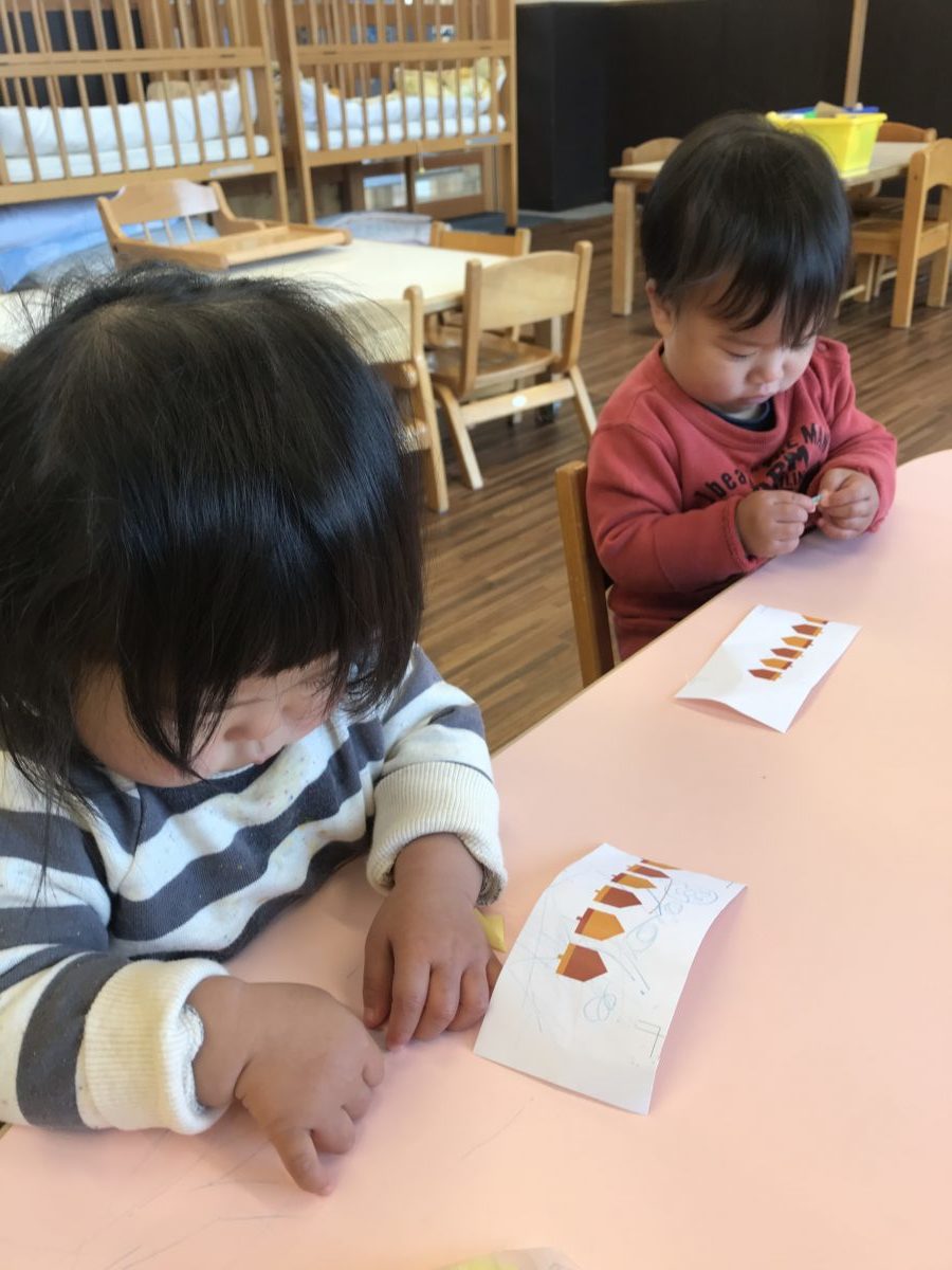 お部屋では昨日に引き続きシールを用意してみました。机に貼ってしまったシールを指先の爪を使ってなんとか剥がそうとする姿もみられました。どんぐりの絵がある紙を用意したのですが、どんぐりとどんぐりの間にうまいこと貼る事が出来ると嬉しそうに手を叩いて喜んでいました。向かいに座っていたお友だちもそれにつられて一緒に拍手!喜びをわかちあっていたのでしょうね。