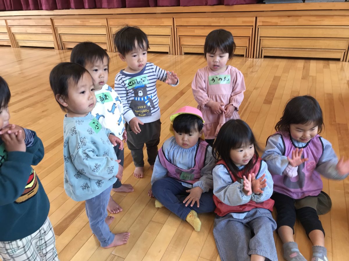 お兄さんお姉さんのリトミックの見学に行きました。始めは椅子に座ってジッと見ていましたが、りんご組のお兄さんお姉さんが楽しそうに音楽に合わせて踊っている様子を見ているとだんだん気になったのか輪に入って参加していました。お兄さんお姉さんを見たり楽器の音に合わせて手拍子やダンスをしていました。
