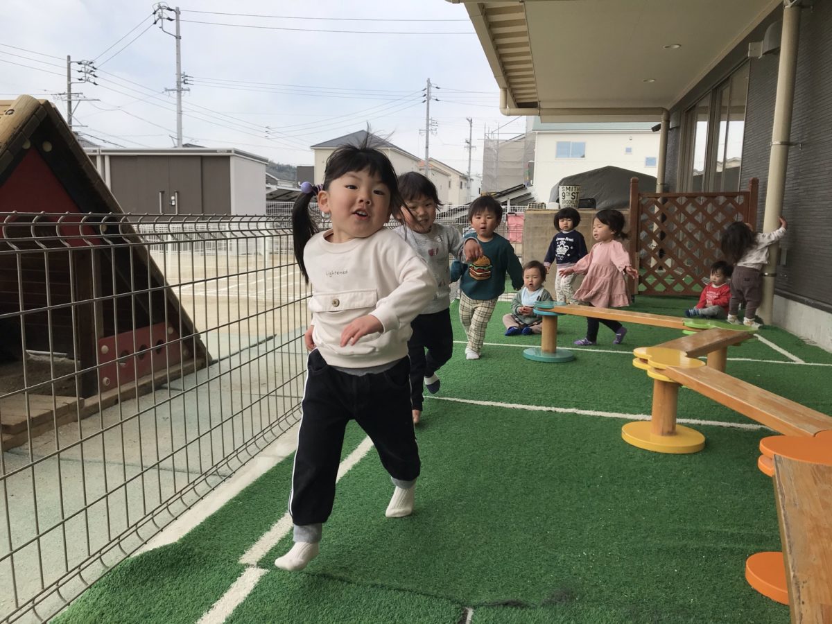 「みて!でんしゃだよ!」お友だちと手を繋いで歩き、電車ごっこをしており、そのうちに「ひこうきー!」と両手を広げテラスを何周も走っていました。その様子を見ていたお友だちも飛行機のように両手を広げて走り、みんなで様々な乗り物を連想してなりきっていました。