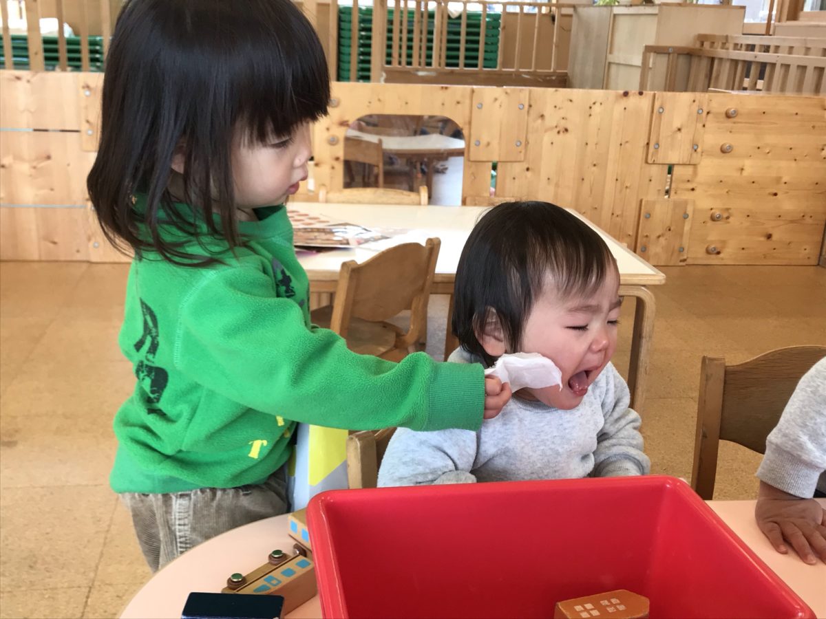 すいか組のお友だちが泣いている事に気が付いて、ティッシュを取りに行って拭いてあげる優しいいちご組さんです。時にはゴミ箱も一緒に持って行ってあげる姿も見られます。