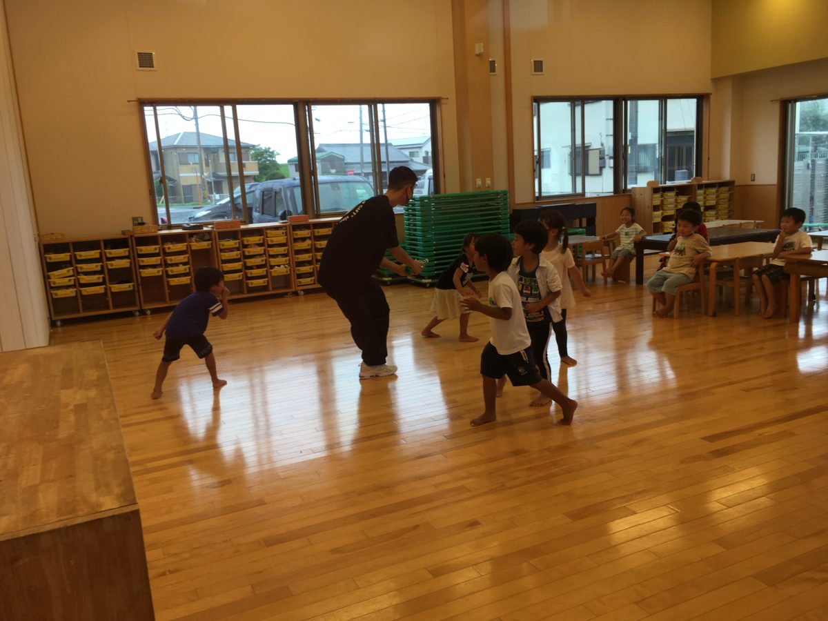 みんなの大好きなダンスの日!ダンスの先生が来園された時から「○○せんせい!」と元気いっぱいな声が聞こえてきました。ダンスに取り組んでいる際は、ステップなどを先生の動きをじっくり見ながら取り組んでいました。ダンスの終わりに楽しんでいた【泥棒ゲーム】でも音楽と共に忍び歩きをしながら円をえがくように動いて楽しんでいました。他のチームの子たちが「○○くんぜったいかつで!」と誰が「どろぼうとして」最後まで残るのかを予想していました。