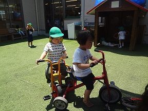 四角、三角の紙を置くと「あー!」とシートの上で形を作る子ども達。紙とのりを渡すと紙に真剣な顔をして貼り出しました。出来上がった作品を額に入れて飾ると嬉しそうに「お家だよ~。ママにも作るの。」と言いながら2つ目も真剣に作る姿がありました。額に飾ってあった作品を見て他の子も「やる!」と言いお家を作っていました。「見てみて!お家できたよ!」お友達にできたことを報告。「一緒だね~。」とお互いの作品を見せ合って喜んでいました。シール貼りではいちご組の子同士シールの剥がせない子に剥がして渡す姿などがみられました。また、お昼のエプロンをお友達につけてあげる姿などがあり、微笑ましく見守らせて頂きました。中庭で三輪車に乗って楽しそうな子ども達。お友達の後ろに続き、一緒に乗るのが楽しいようで、中庭を何周も何周も回ってました。