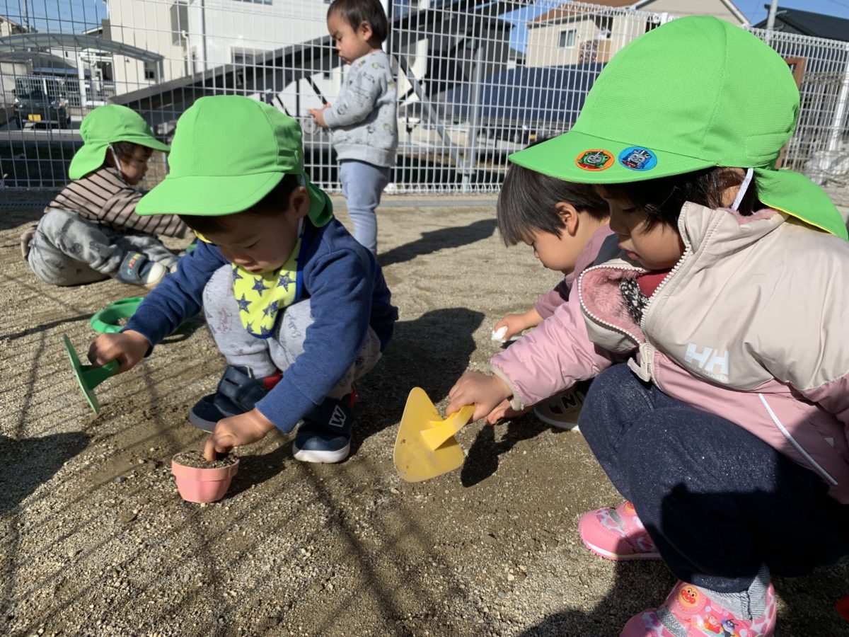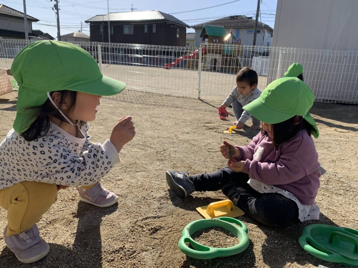園庭に行くと、砂場のおもちゃを使ってごっこ遊びが始まっていました。子ども同士の会話が盛んになってきて「ごはんどーぞ!」「たべるー」と話しながら砂で作ったごはんを食べる真似をしたり、お友だちに渡していました。またそんな中お皿の中に石をたくさん集めている姿がありました。どうするのかな?と思い様子を見ていると、その石をお金に見立てて、砂のご飯をくれたお友だちに「これ、おかね!」と石を渡している姿がありました。