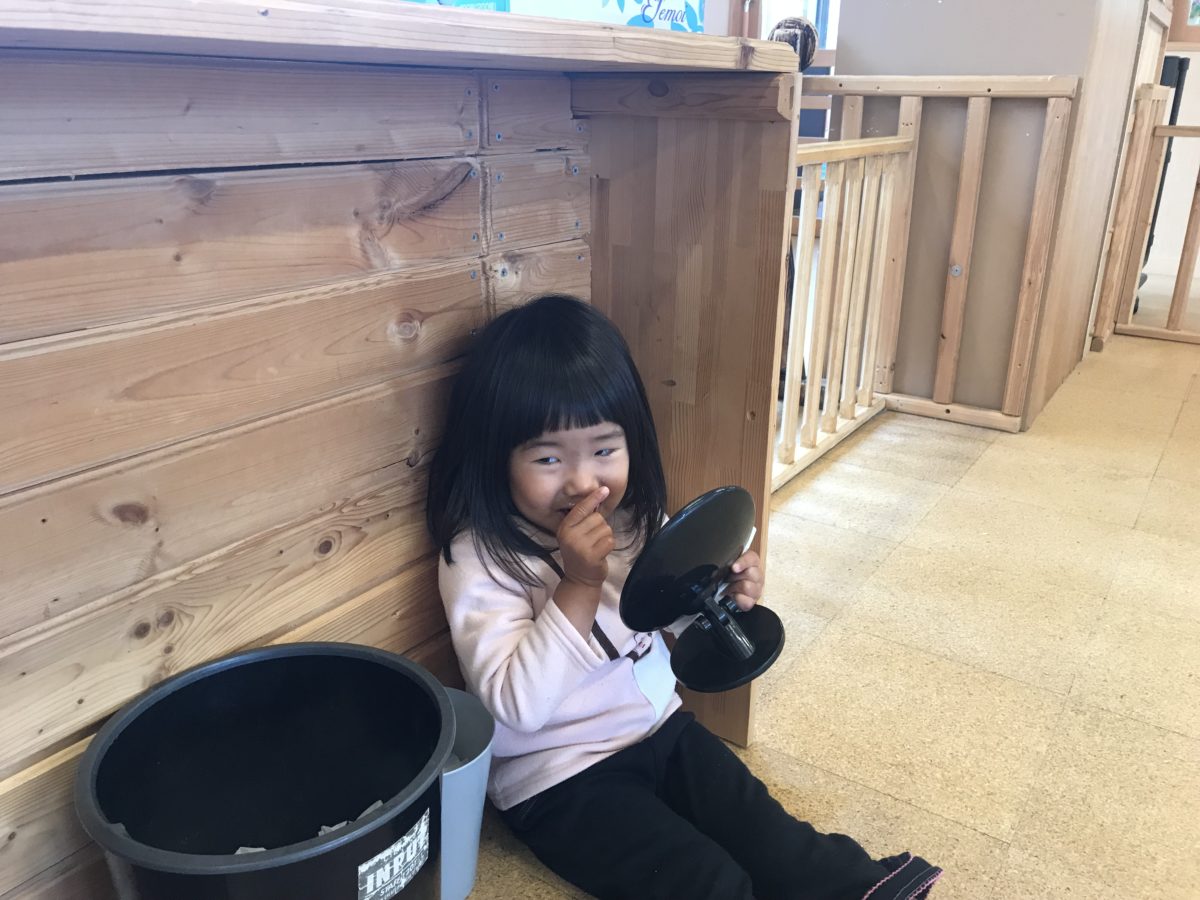お部屋の隅から小さな歌声が‥ 見ると、鏡で自分の顔を見ながら歌を歌っていました。保育士と目が合うと恥ずかしそうに笑っていました。恥ずかしそうな表情が可愛らしかったです。