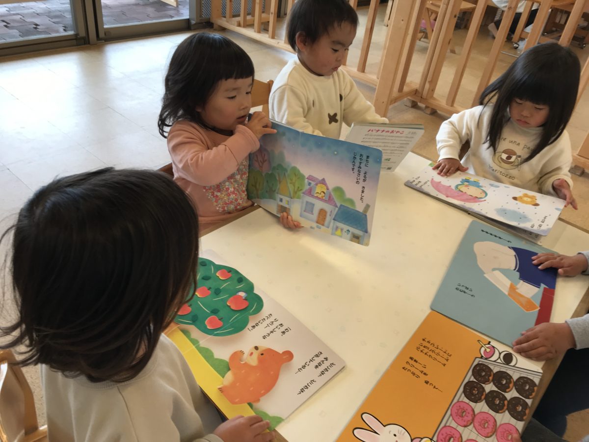 それぞれ好きな絵本を選びました。じっと絵を見たり、お話の内容を覚えているお友達は声を出して絵本を読んでいるかのようにお話しをしていました。保育士のように、歌の絵本をみんなの方に向けて歌ってくれるお友達もいました。とっても上手でしたよ。