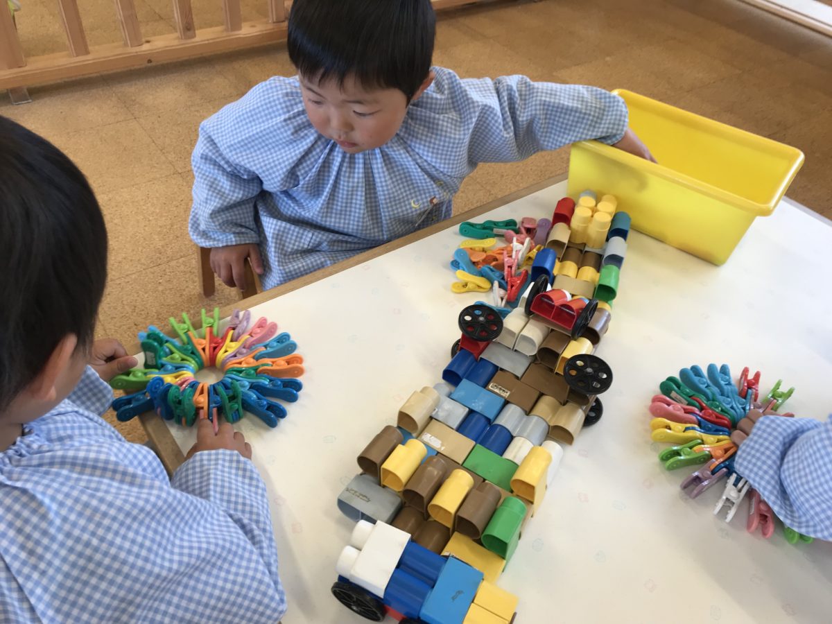 今日はりんご組のお友達と一緒過ごしました。りんご組のお友達はさすがお兄さんお姉さんです。ブロックで作る車はとても大きくて、しかも長いです。それを見ていたいちご組のお友達も、長~く組み立て、大きな車を作っていました。粘土遊びでは、りんご組さんが手のひらをクルクル回して丸を作っていると、いちご組さんも真似をして手のひらをクルクルするのですが、ん~ 何だか上手く出来ないなあ。でも満足そうでしたよ。泣いているお友達がいると、テイッシュを持ってきて渡してあげ、涙をふき終わるとゴミ箱を持ってきていました。お友達の様子に気づき、思いやる優しい気持ちが出てきましたね。