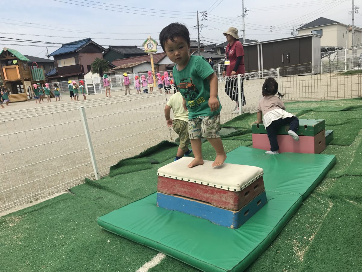 テラスでは、登ったり降りたりを繰り返し楽しむ様子から、巧技台と跳び箱を並べてみました。すると子どもたちは巧技台では足からそっと、跳び箱からはジャンプして降りるなど、高さを見て考えながら降りる姿がありました。足からそっと降りようかなと座ったり、ジャンプしようかなと立ってみたりと繰り返し考える様子はとても真剣な表情でした。