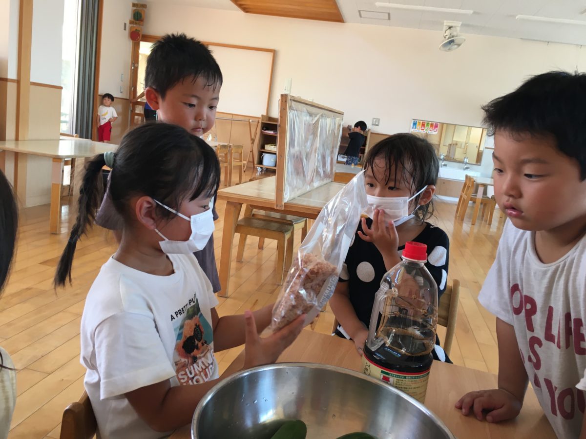 きゅうりのクッキングに「かつおぶし」を用意しました。「これ、しっとる!」「たこやきにもかけるやつ!」保育士がお肉の仲間か魚の仲間かどっちかな?と出題すると、「このいろは・・・にくじゃない?」とお友だちと考える姿がありました。