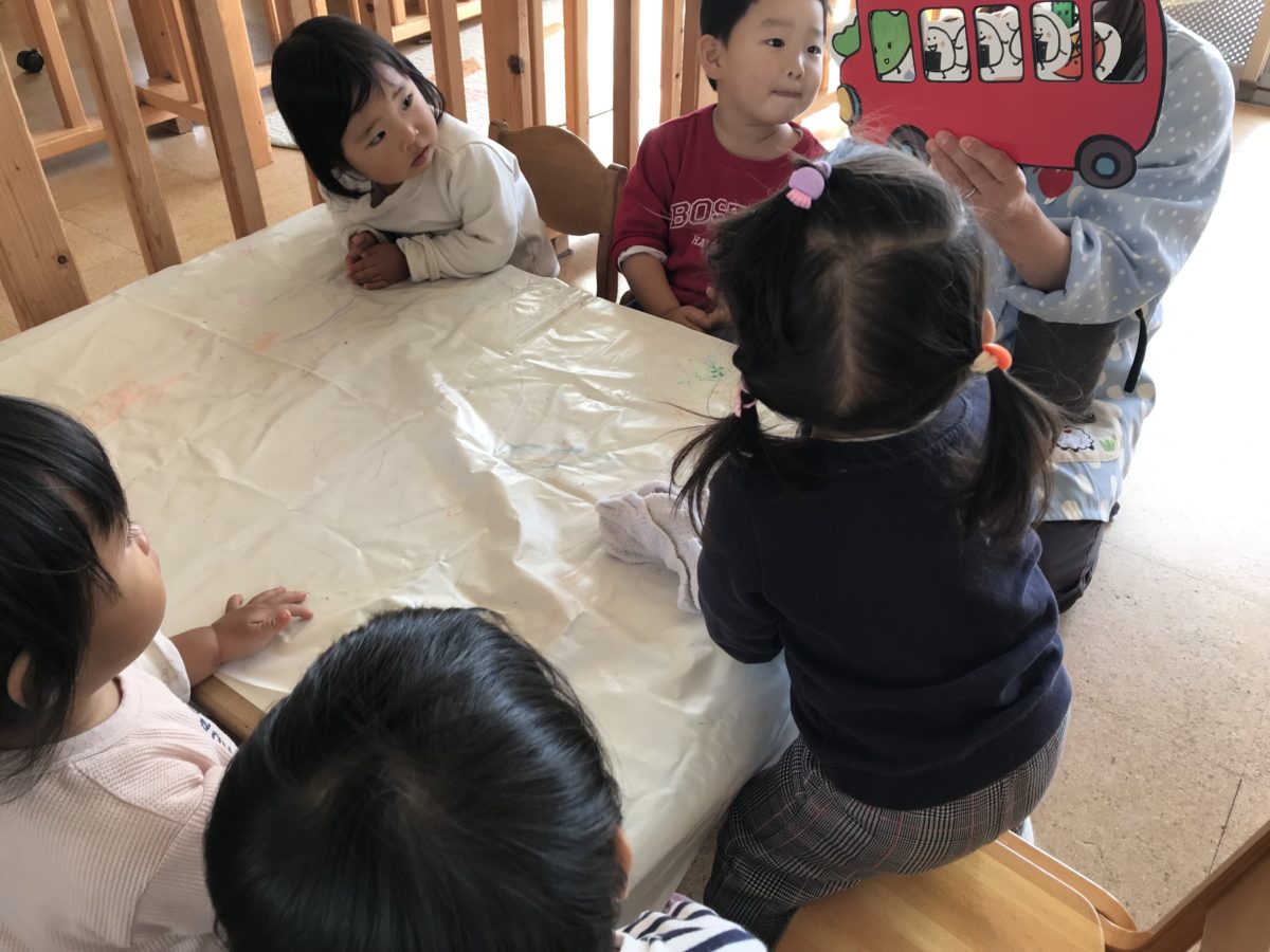 絵本でおなじみの『お弁当バス』のペープサートを鑑賞中。