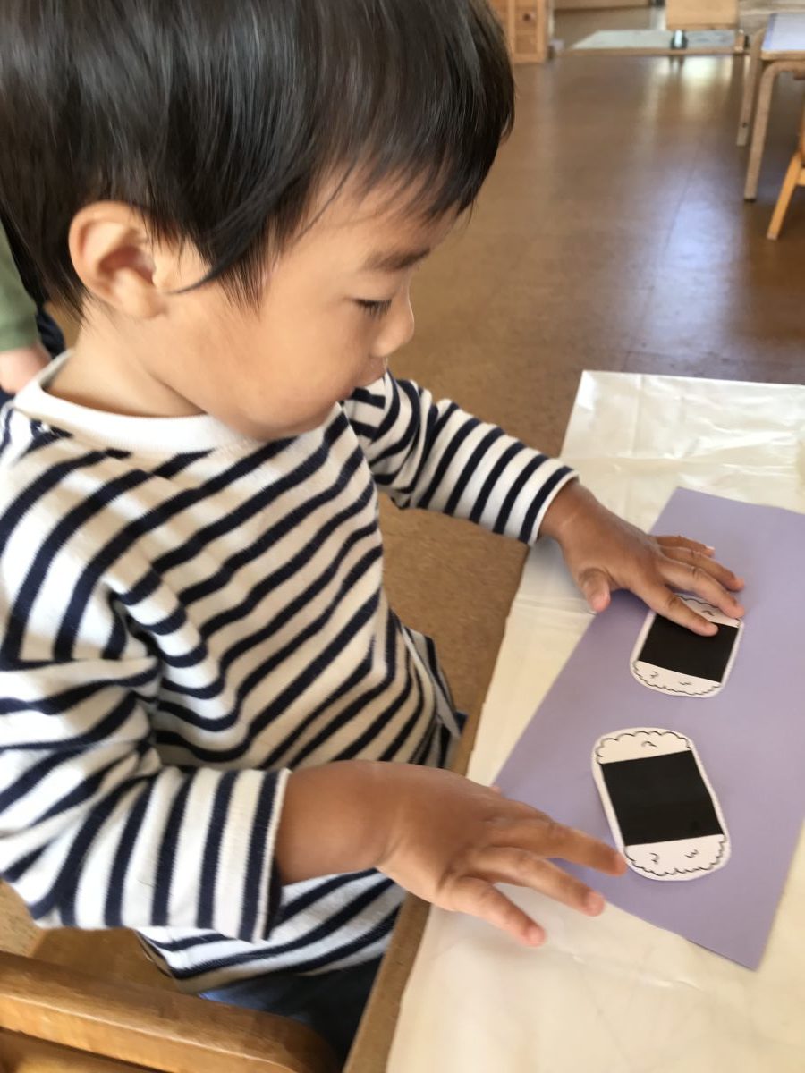まだのり遊びに興味がない子も台紙に好きなおかずを並べて楽しむ姿があったり、自分の作ったお弁当を保育士に見せに来てくれたりと、とっても楽しそうにお弁当作りに参加してくれていました。
