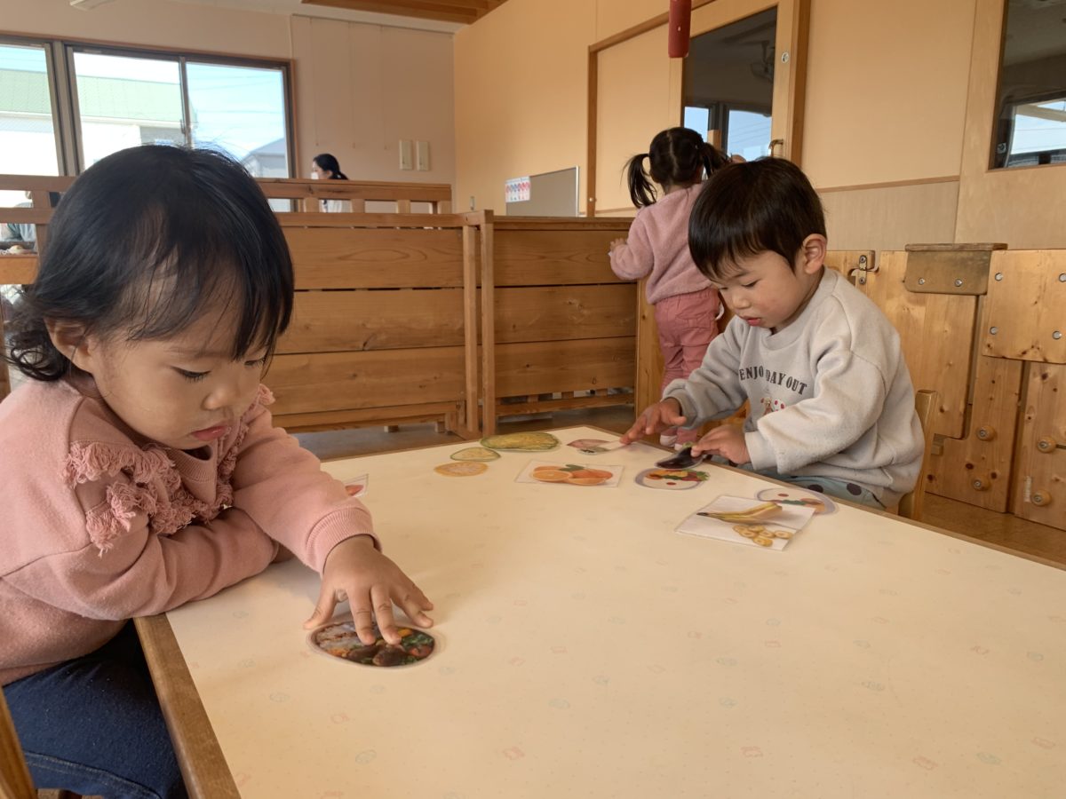 さまざまな食べ物のカードを置いておくと「みかん」「かぼちゃ!」「あーん!」と知っている食べ物の名前を言葉にしたり、食べる真似をしていました。