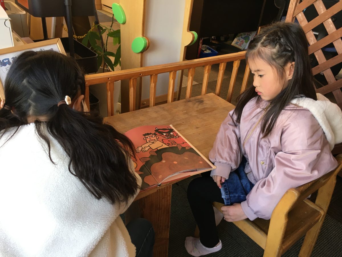 絵本コーナーでは朗読する姿が見られるようになり、お友だちが真剣な表情で聞き入っていました。