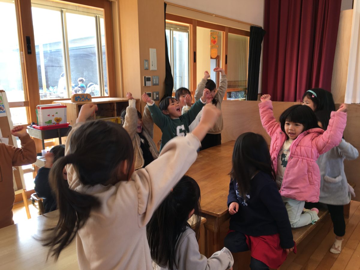 しりとりチーム戦では、長い戦いの末にリボンチームの勝ち!!と勝敗が決まりました。「やったー!!」と歓声と共にガッツポーズが決まっていました。