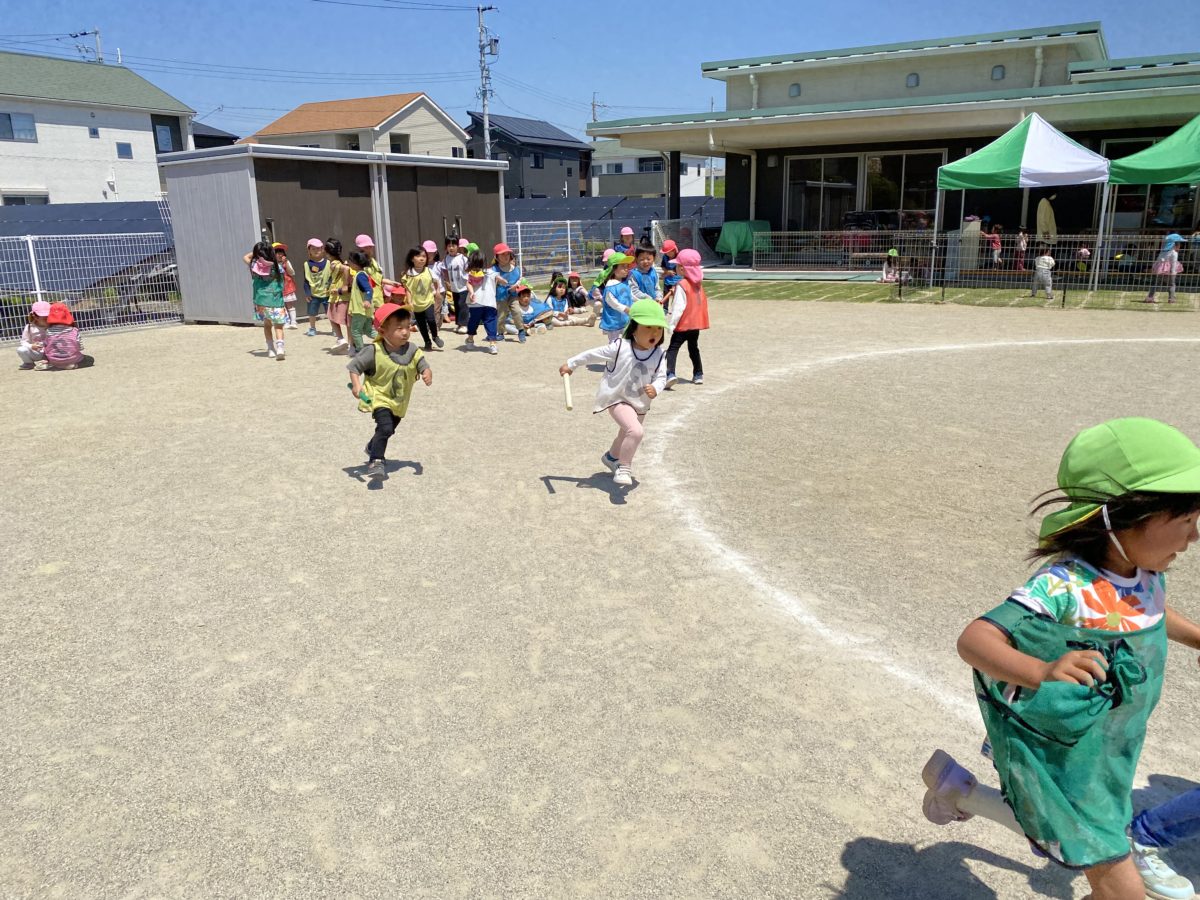「はいっ!」と元気にバトンをもらった後、力いっぱい走り出すお友だちの姿がありました。さくらんぼ組さんもばなな組さんもがんばっています。