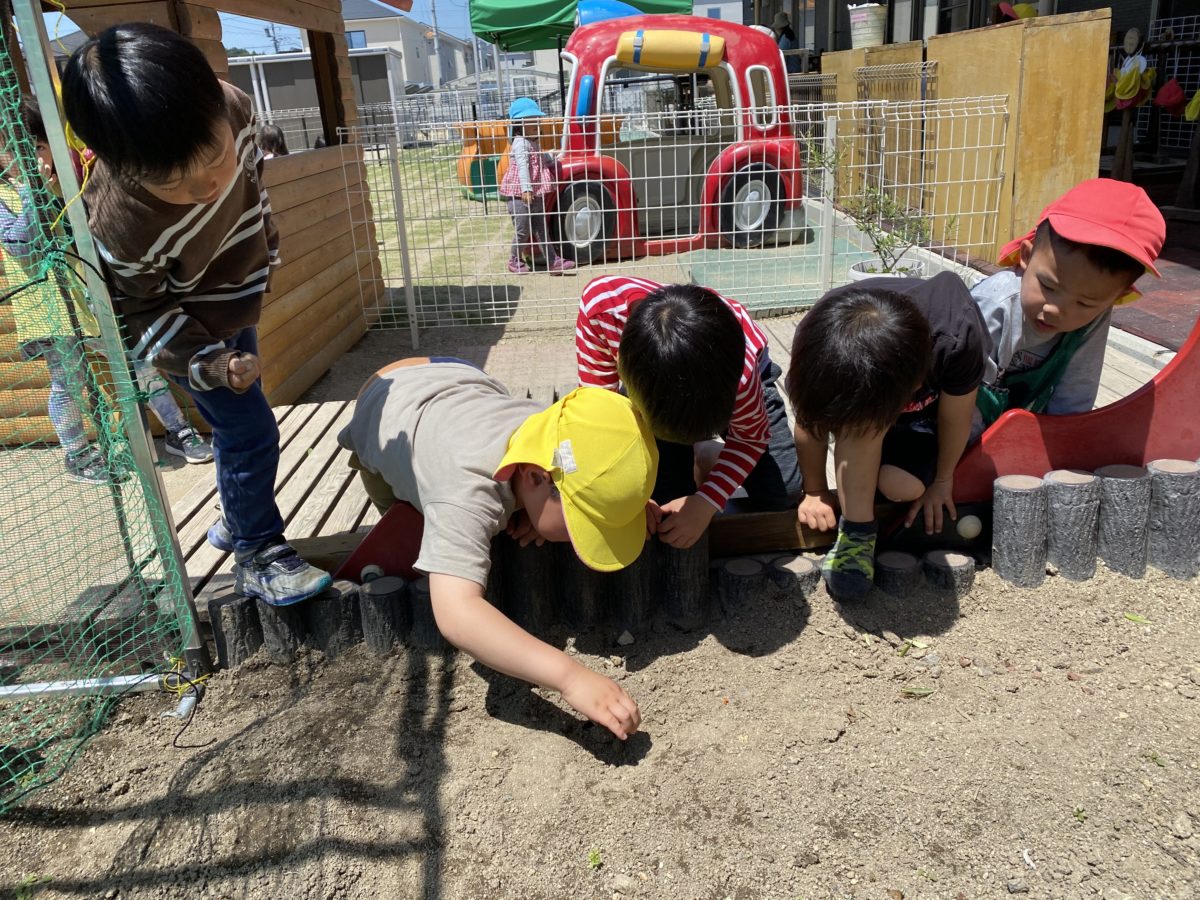 「ありのす、みつけた!」「ここ!」壊さないようにそっとお友だちと一緒に観察する姿がありました。