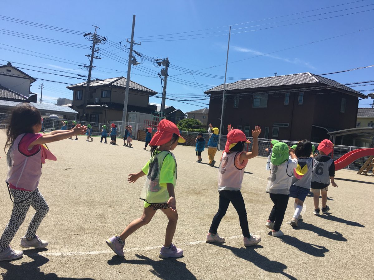 今日は朝からとってもいい天気で子どもたちから「きょうはりれーできる?」「えんていにみずたまりあるかな?」2日間、雨で外に出れなかったこともあり、子どもたちも走れることが嬉しいようで、「もうビブスきたでー」「もうぜんぶびぶすくばりおわったよ。」と子どもたち自身もやる気満々でした。園庭に出て音楽が聞こえてくると「おんがくきこえてきたから、すすんでー!」とめろん組のお友だちが声をかけると音楽に合わせて手拍子しながら入場していました。そして、今日の縦割りリレーはどのチームも抜かし合いが続きいい勝負。少し前までは大きい子に手を引いてもらって走っていたさくらんぼ組のお友だちもバトンゾーンに立つと手をしっかりと伸ばして前の子からバトンを受け取ろうと待つ姿がありました。室内では「これ、うんどうかいにかざるやつ。」「わたし、ろしあとあめりかはしってるけど、このなかにあるんかな?くにのはたはしらんのやけどなぁ~。」と自分が知っている国を探そうとする姿があり、「こっきかいてみようかな?」と国旗の写真を見ながら今日も自分の自由画帳に描こうとする子どもたちの姿がありました。また、鳴子などを使った後には「これきれいにしないとね」と整理整頓し明日も使いやすいように準備をしようとしていました。また、太鼓をしているめろん組さんを憧れのまなざしでいつもみているばなな組さん。「おてつだいしたい!」とめろん組さんが使った太鼓のばちなども一緒に片づけをし「おてつだいできた!」と話していてお手伝いできたことも嬉しかったようでした。