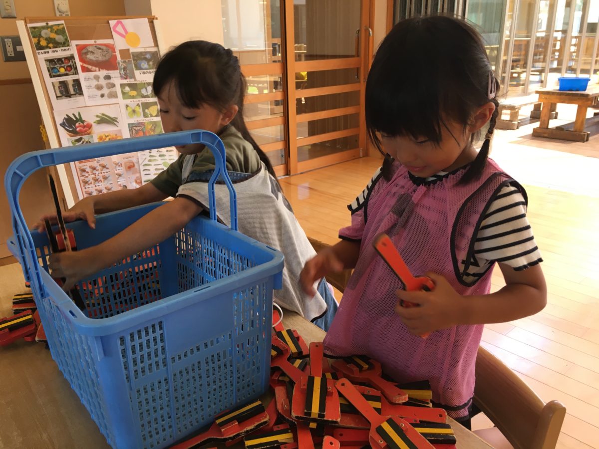「つかったやつきれいにしよう!!」と自分たちが作った鳴子を綺麗に整頓しています。