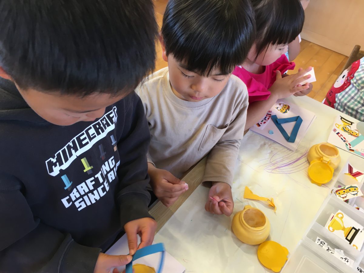 ここにのりをつけてな…と自分のが出来た子がみんなに教えています。素敵な物が完成するかな?