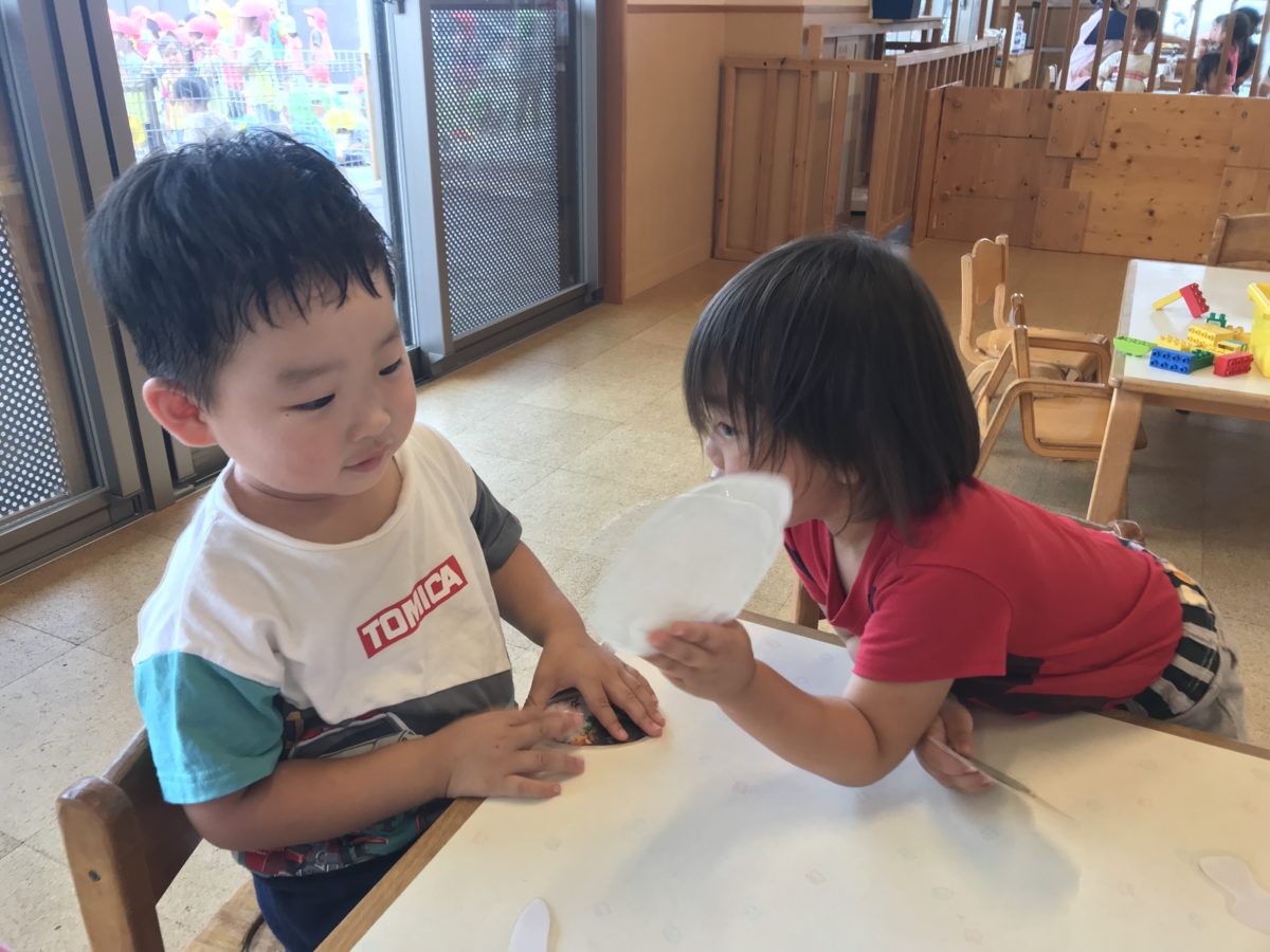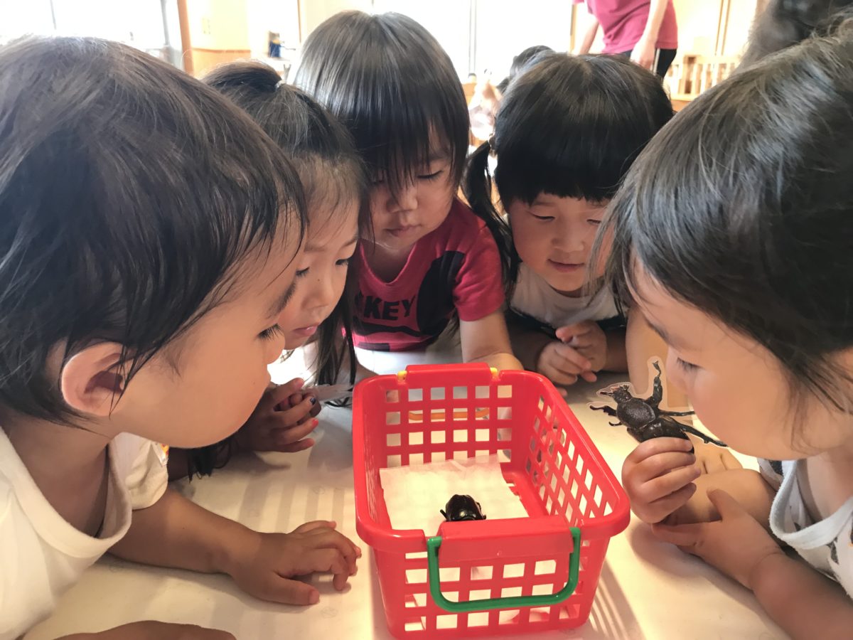 今日は以前虫の図鑑を見た時にカブトムシで喜ぶ姿が見られたので、今日はカブトムシの写真を形で切り抜いていると、子ども達大喜び!「これなに??カブトムシ?」「ツノないけどからなに?」「これもカブトムシ?」カブトムシのメスとオスの写真両方を用意していたのツノがないのもカブトムシなのかを疑問に思って話をする姿がありました。知っている子が「ツノが無いカブトムシだよ!」と教える姿もあり、「ツノがなくてもカブトムシー!」とメスカブトの写真でも大興奮でした。とても興味津々に話をしていたので、事務所で飼っているカブトムシの観察に出かけました。カブトムシを大人の手の平に乗せて動いている所も観察出来ました。「動いてるね!!」「こっちよー!」実際カブトムシムシがこちらに寄ってくると、「こっちはだめよ!」と少し怖いの、近づいてくると距離をとったりして、カブトムシ観察を楽しんでました。「カブトムシぴかぴかね!なんで?」と不思議そうにする姿もあり、カブトムシの背が黒々と光っているのに疑問を感じたのか、不思議そうにしてました。