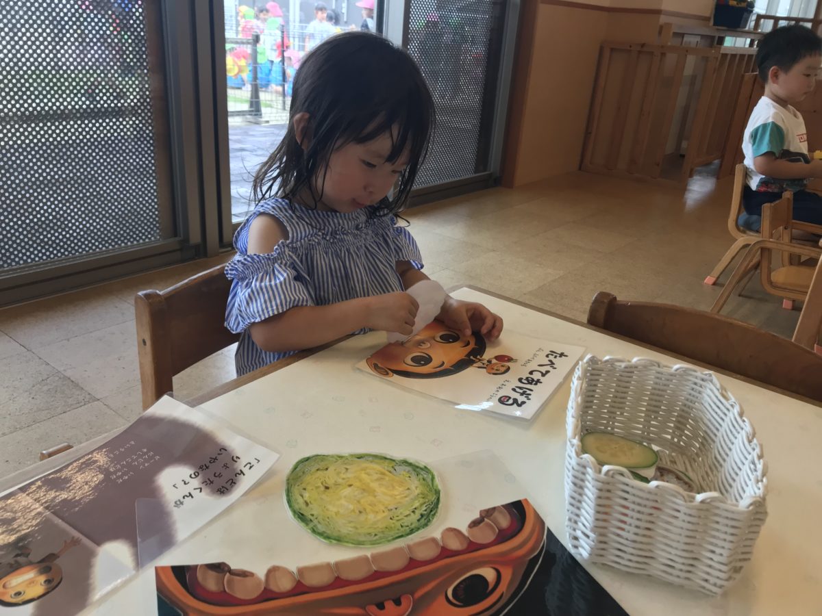 ”たべてあげる”の絵本が最近お気に入りで、絵本に出てくる登場人物に食べ物を食べさせてあげ