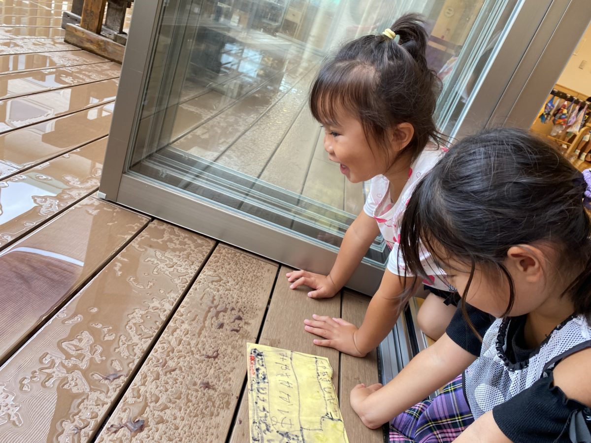 今日はめろん組さんは今年度初のサッカー教室の予定でしたがあいにくの雨で延期となりました。残念そうに「サッカーしたかったー」とお友だちと話す姿が見られました。おとまり保育に向けてお金を貯めるお財布が一人ひとりオリジナルのものが出来上がってきて、みんなの素敵なお財布を並べて飾ってみました。「すごーい!!」「これほしい!!」「これがすき!!」とさくらんぼ組さん、ばなな組さんのお友だちが集まってきていました。ポケモン!パトカー!ねこさん!アイス!そら!好きなデザインのものを探して選んだり、「これはだれがつくったん?」とめろん組さんに尋ねたりしていました。お財布を褒めてもらっためろん組さんもとても嬉しそうにして、とまるのがおうちのひとおらんでなぁー・・と不安なお友だちもおとまり保育へのわくわく感が増したようでした。またマーカーで描いたものをテラスの濡れているところに置いてみるとインクが移動する様子、紙のインクが薄れていく様子にびっくり!!「うごいとるみたいー」「きえた!!」とインクの変化を楽しんでいました。また笹の葉の数を数えながら「なんかおちゃみたいなにおいがする」と香りを気にかけたり、「なんまいあるのー!?」葉の数の多さに驚きの声が上がっていました。