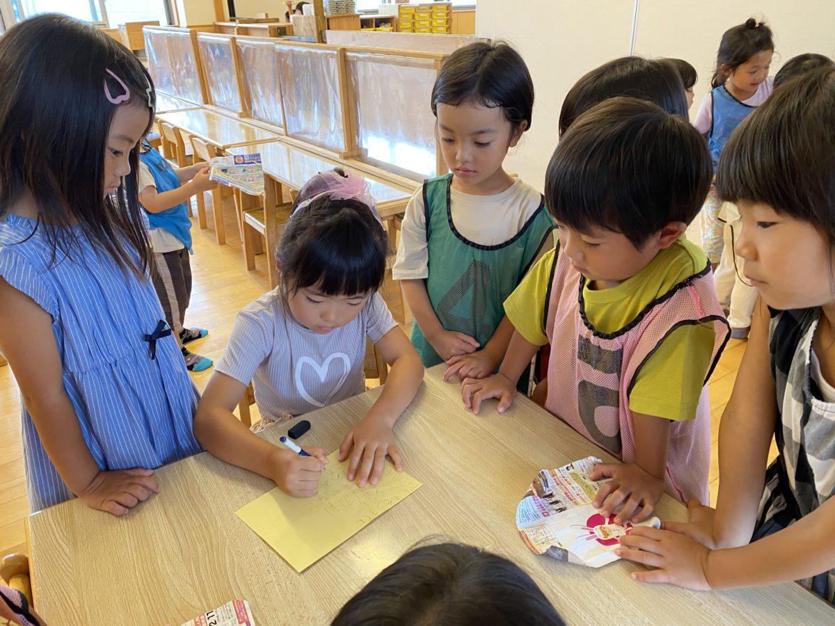 「どのおさいふがほしい?」「それは〇〇ちゃんの!」誰の財布かすぐにわかるお友だちが注文をとるかのようにほしいお財布を作ったお友だちの名前を書いていく姿がありました。