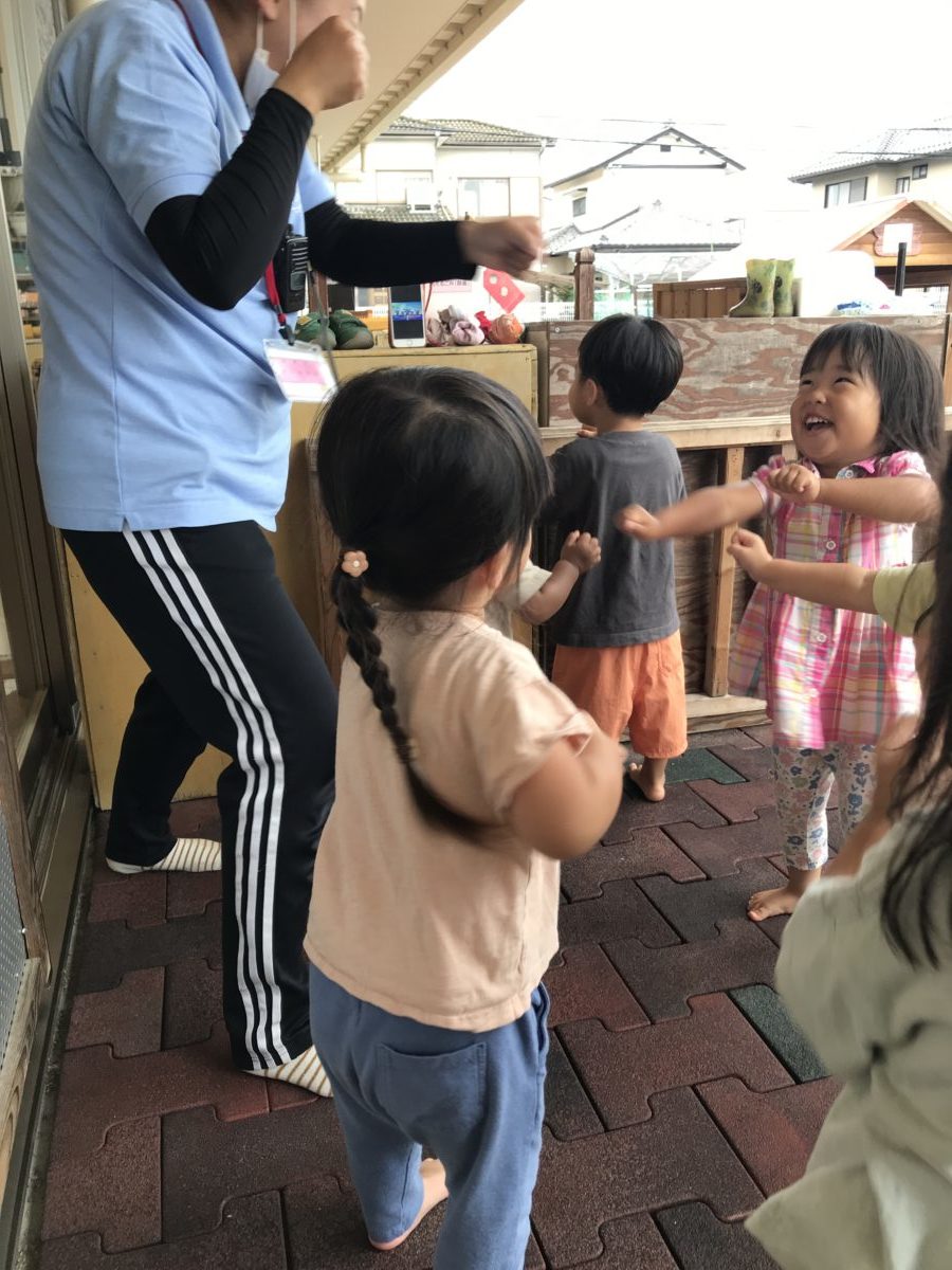テラスでは、昨日から未満児で流行りだした『ポケモンのトレーニングダンス』に夢中になって踊る子どもたちの姿がありました。