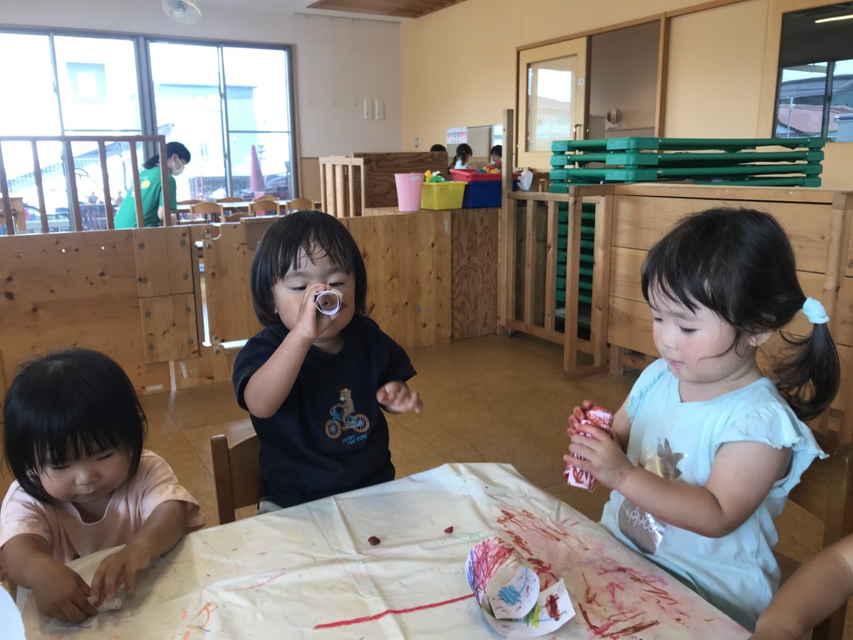 「あめザーザー!」と紙いっぱいに色を塗っているお友だちやそれを見て「これも使って!」と青いクレヨンを渡すお友だち、「みて!これパパ!」と家族の絵を描くお友だちもいました。思い思いの絵を描き終わると、クルクルと紙を巻いて穴から覗いてお友だちを見たりクレヨンを入れたりして楽しむ姿や、自分の絵を大切そうに持って遊びに行く姿もありました。
