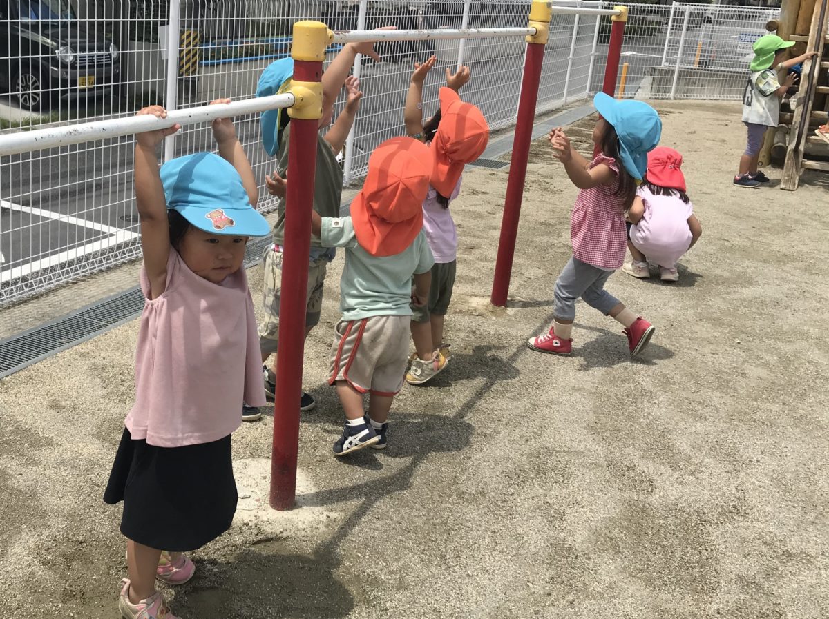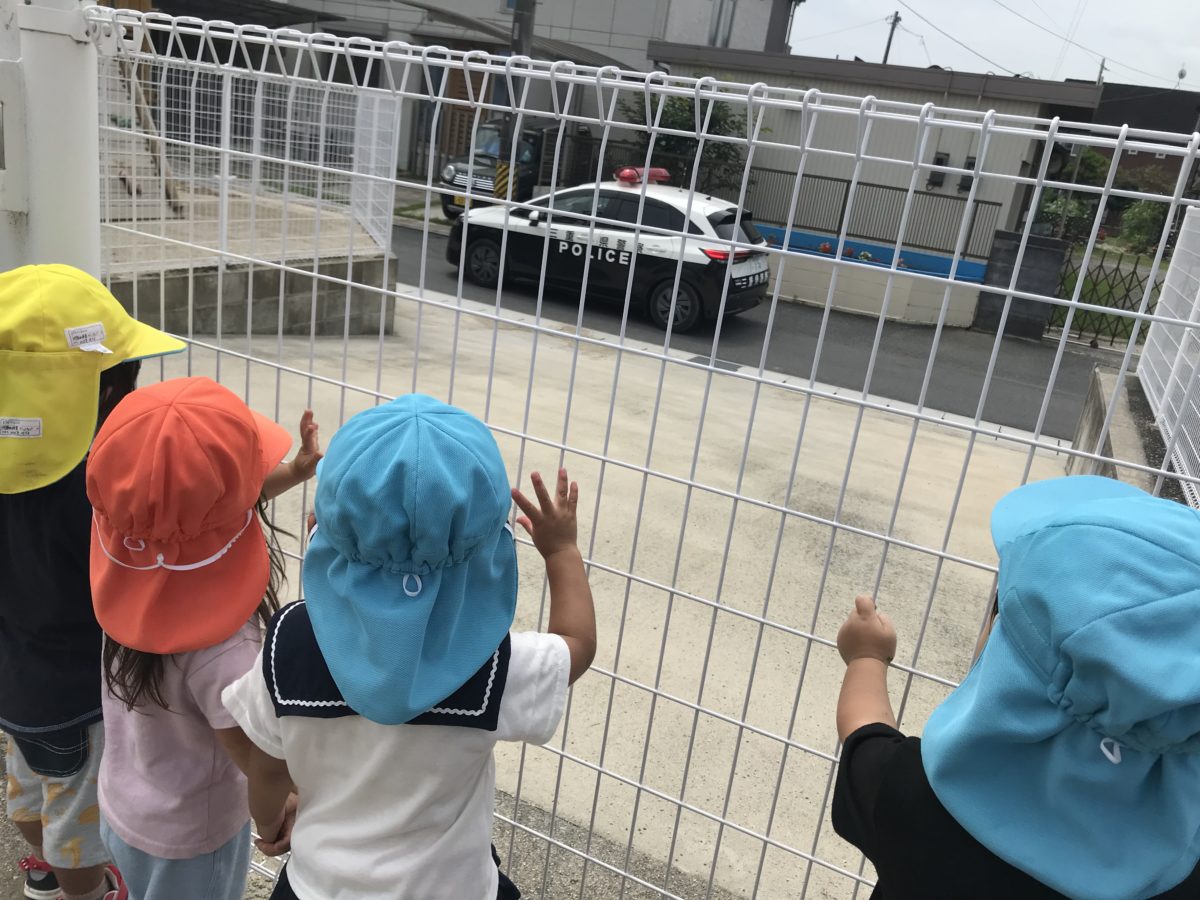 園庭で遊んでいるとパトカーが止まっているのを発見!急いで見に行くことに。「パトカーや・・・」と間近で本物のパトカーとお巡りさんを見てビックリしながらも最後は「バイバーイ!」とみんなで手を振ってお見送りしました。その後も園庭で鉄棒やリレーを楽しみました。いちご組さんもりんご組さんの姿を真似して鉄棒に一生懸命手を伸し、届く高さを見つけると嬉しそうに何度もぶら下がっては降りてを繰り返していました。また、バトンを持っていると大きい組のお兄さん達が手を繋いだり横で応援したりしながら一緒に走ってくれて、ぐるっとトラックを一周して楽しそうな姿がありました。