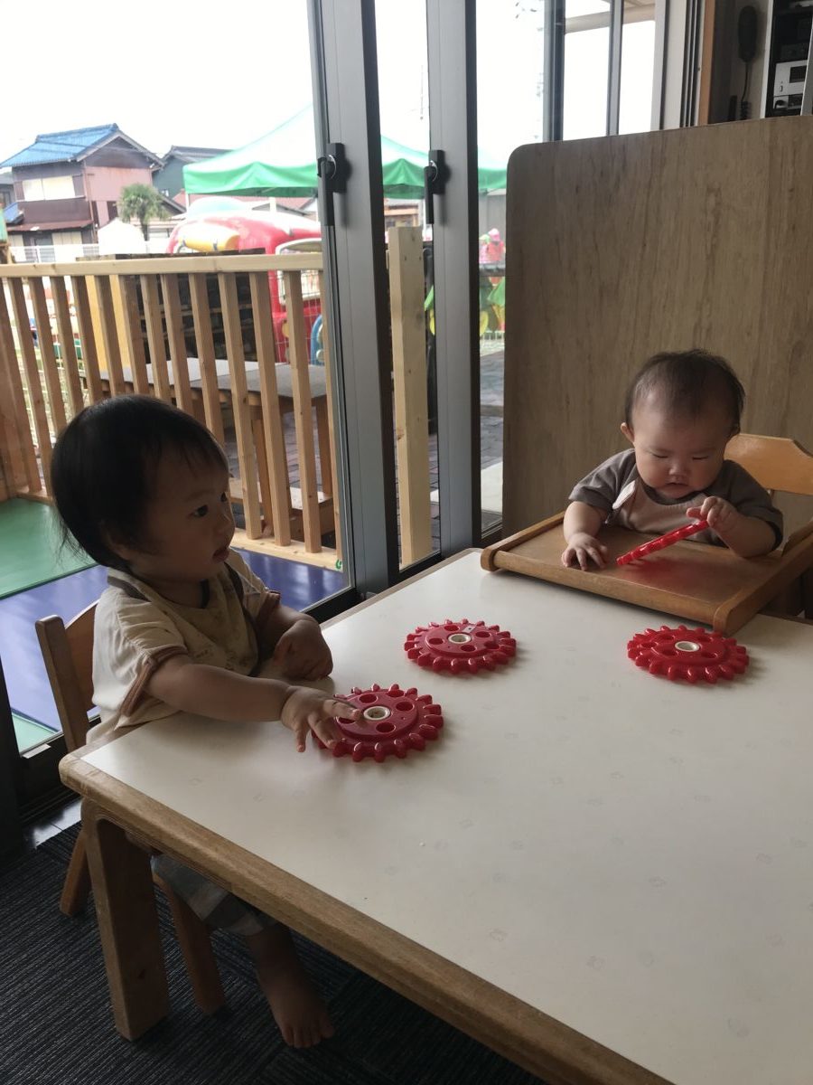 すいか組さんは歯車のおもちゃをクルクル回したり穴を覗いたりして楽しむ姿がありました。また、園の中を散歩していると大きい組さんのプールの様子に興味津々で窓越しにじっーと覗いて見る姿もありました。