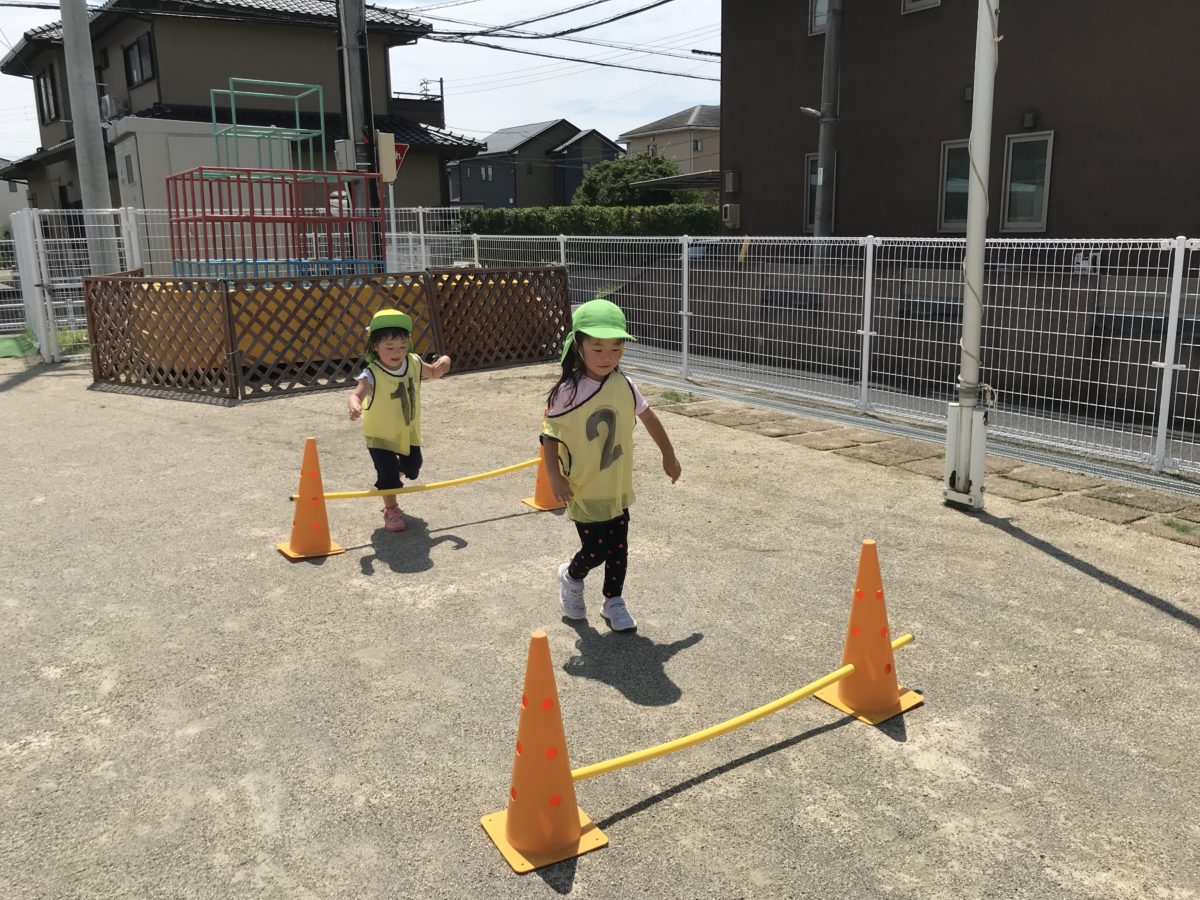 園庭で身体を動かすことが大好きな子どもたち!ドッチボールしたいという声があったのでやりたい子を自分たちで集めドッチボールをすることになりました。さくらんぼ組のお友だちもやりたい!と一緒に入りましたがルールが分からず困っていました。それをみためろん・ばなな組のお友だちが寄り添い「ドッチボールしってる?」「からだにボールがあったたらあかんのやで」「でもかおにあったたらセーフ!」とルール説明をしてあげる優しい姿がありました。いざドッチボールがはじまると「わあーにげろ!」「ぼくはキャッチする!」とそれぞれ真剣な姿で楽しんでいました。