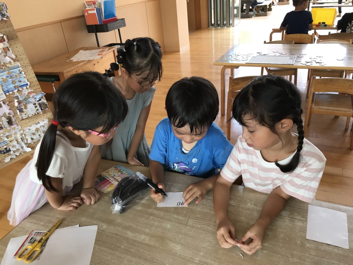 先日から畑にできている野菜に興味を示している子どもたち。「ナスむっちゃおっきくなっとんで~」「トマトもできとるよ!!」「トマトはまだみどりやでたべれやんのっちゃう~?」「ナスはおっきいでたべれそう!!」と会話する様子があったので今日はナスの収穫に挑戦しました。収穫しようと畑の中に入り大きなナスを探している子がいますが、なかなか見つけられず苦戦する姿がありました。周りでみていたお友だちが「いっしょにさがしたろか~?」と優しく寄り添ってあげ、みんなで「どこかな?」と探している姿がありました。お友だちが葉っぱをめくると下の方に大きなナスが!!「あ!あった!!」「ここにおるよ!」とみんなで探したナスをようやく収穫することができました。お部屋に持ち帰り、最近メニュー表やレジスターを使いごっこ遊びをする姿があったので今日は販売することにしました。「なんてかこう~?」「スーパーでねだんかいてあるのみたことあるで!」「あとは・・・やさいのなまえとかもかいてある!」と子ども達で相談しながらスーパーや野菜売り場で見たことがあるものを頼りに値段表を書いている姿がありました。値段表の紙にはナスの絵や『おいしいよ』と描かれており子どもたちの買ってもらいたいという気持ちが溢れていました。
