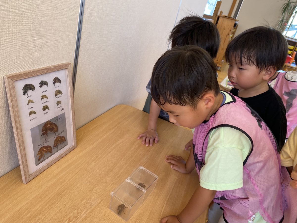 セミの抜け殻の観察中です。抜け殻の種類の資料を見ながらアブラゼミ!?ミンミンゼミ!?とセミの名前がたくさん聞こえてきました。