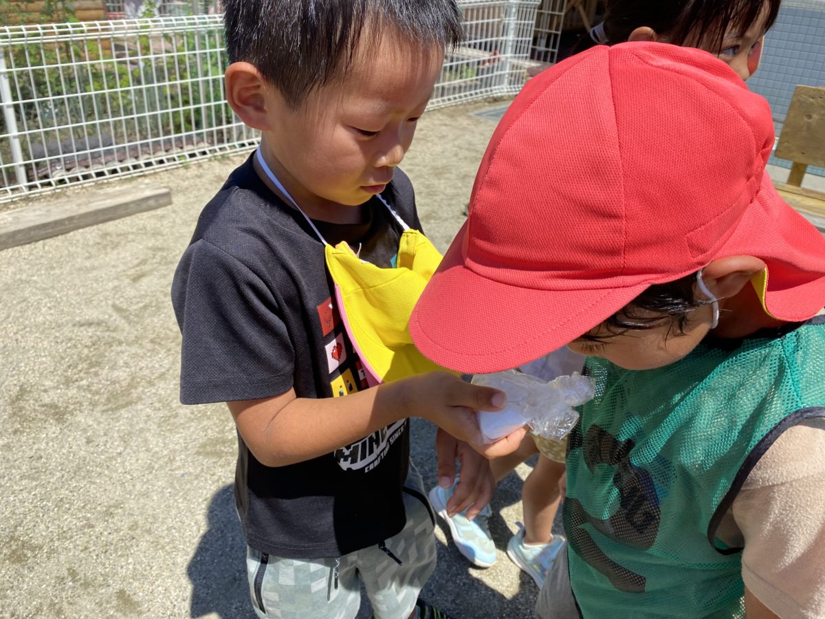 野菜の収穫をしていると畑のしきりにアリの巣を作るたくさんのありさんを発見!!「すごーい!いっぱい!」何かを一斉に探しているような動きをするたくさんのアリに驚きながら、「あまいのさがしとるんちゃう?」「えさ、はこぶんやで」「さとうがありさんはすきなんやで!」と生き生きと話すお友だちの姿から「砂糖」と「塩」を用意してみると袋の外から触りながら手触りの違いを感じ「どっちがさとう?」と砂糖か塩かどちらかなとお友だちと確認していました。ありさんの近くに砂糖と塩を置いてみるとありさんくるかな?くるかな?とドキドキしながら、ありさんの動きを見守る姿がありました。またさらさらさらっとしているのが塩、小さなかたまりがまじっているのが砂糖と比べていました。予想していたよりもありさんに動きがなく、「もっとあまいの!」とマーガリンを置いてみるとアリさんが来る前に地面の上で溶けていくマーガリンの解ける速さにびっくりし不思議に感じていたようでした。また砂糖の小さなかたまりを運ぶアリの様子をみることができ、たくさん群がる様子に驚きながらだんだん食べたのか運んだのか砂糖がなくなっていく様子に驚いていました。