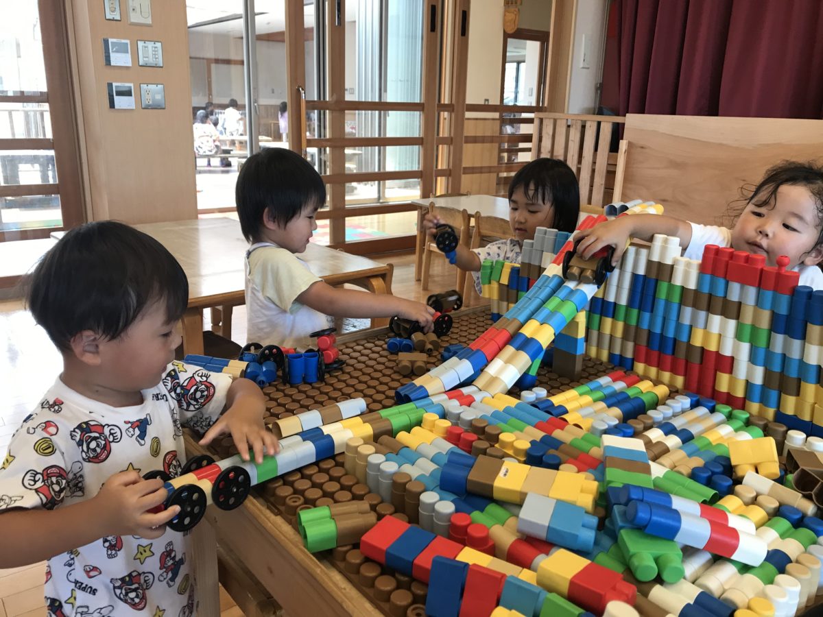大きい組のお部屋にも遊びに行くと、ブロックで作ってある大きな滑り台を見つけて「すごーい!」とみんな大興奮。さっそく車輪のついたブロックを滑らしたり、逆から登らせたりしていました。滑り台が崩れてしまうと、次は自分たちでブロックの道を作ってその上を「ブーン!」と走らせてとっても盛り上がっていました。