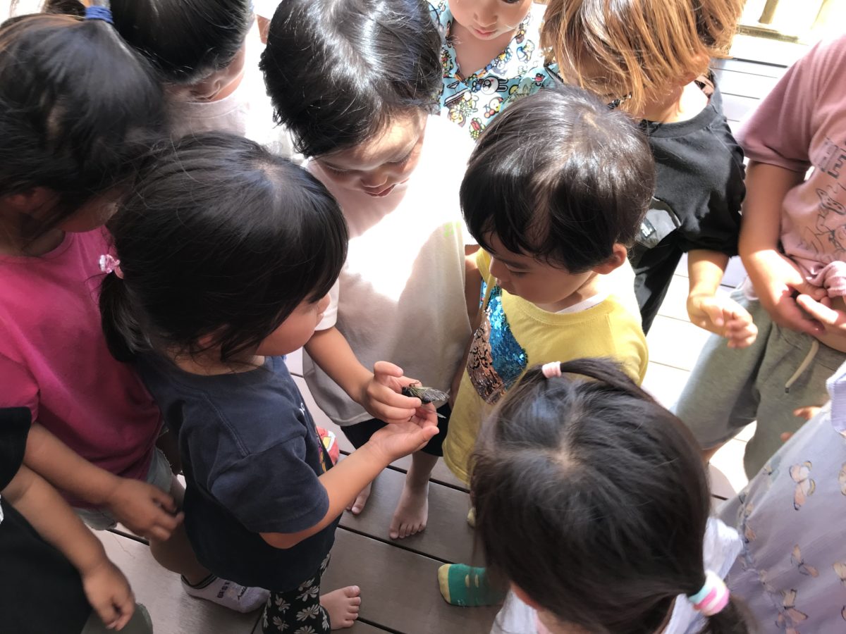 テラスに飛んできたセミを捕まえたお友だち。「みて!セミつかまえた!」とみんなで観察中!セミの鳴き声を聞き「これクマゼミや!」とセミの種類に気付く様子がありました。