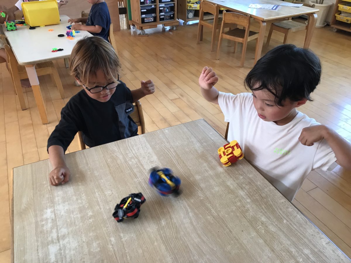 よーいどん!!おもちゃで作ったコマを回して対決!
