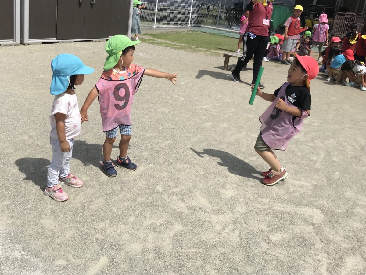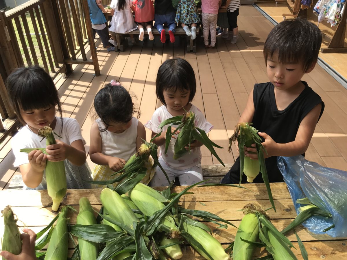 自分達で給食のメニューを書いている子ども達。「きょうのおやつはとうもろこしやで~」「かわむきできるんちゃう?」とワクワクしている声が聞こえてきたのでとうもろこしの皮むきに挑戦しました。以前もとうもろこしの皮むきをしたお友だちは「これやったことある!」「こやってするんやで~」とやったことがないお友だちに優しく教えてあげていました。また、「いっしょにする!?」と大きい子に誘われてりんご組さんも皮むきをしました。はじめは皮が固く苦戦していましたが、大きい子にお手伝いしてもらいながら挑戦する姿がありました。どんどん皮をめくっていくと「わあ!みえてきた!」「とうもろこしおっきーい!」と嬉しそうな表情をする様子もありました。園庭では、りんご組さんと手を繋ぎ一緒にリレーを走ってくれるさくらんぼ組さんの姿が!以前までは大きい子に引っ張ってもらっていたさくらんぼ組さんも少しずつですがお兄さんお姉さんになっているようです。