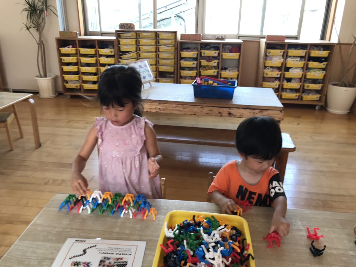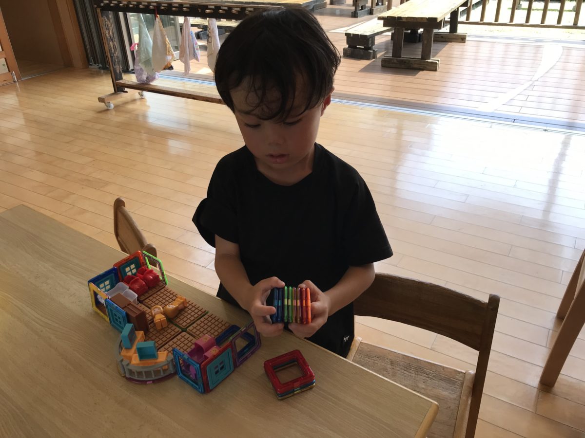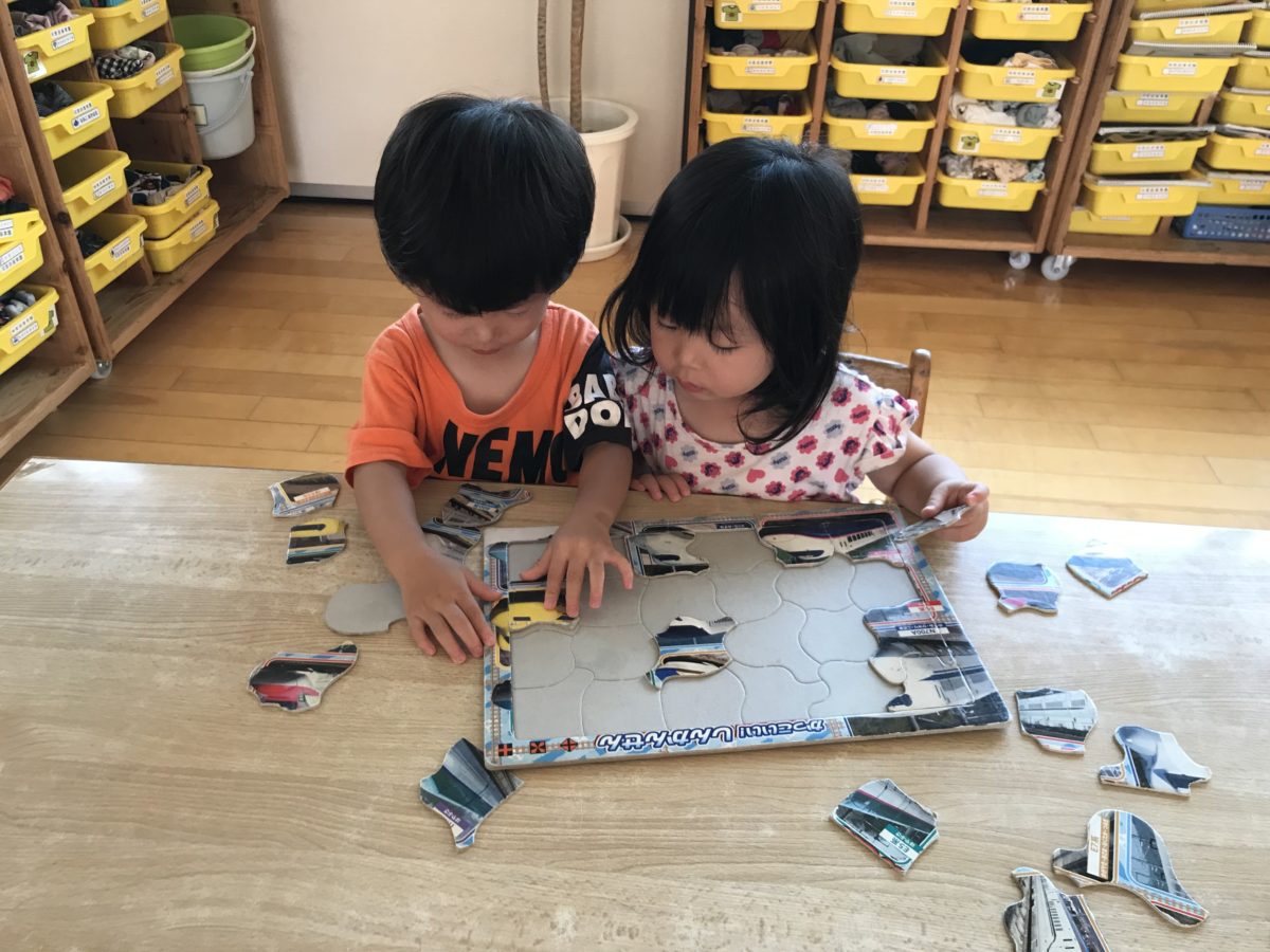 タイルや窓などが付いている磁石のおもちゃに興味津々!タイルの付いているものを床にしたり窓のついているものを壁にしたりとみんなで協力しながら器用にお家を作る姿がありました。ベットやタンスなど綺麗に設置しお家ごっこの始まりです。「ここにおふろおこうよ!」「ここからはいるんだよー」「どこにベットおく~?」「ここでねんねしよ~」とたくさん会話しながら楽しんでいました。また、「ごはんたべよ~」「ごはんたべるまえにてあらわなあかんよ~」と自分たちが生活しているときに行っていることを真似しながらごっこ遊びをしている様子もありました。大きいお友だちは磁石の仕組みに興味津々!「こっちはひっつかんのにはんたいにしたらひっついた!」と疑問に思っている姿がありました。小さい子はパズルに挑戦する姿がありました。端の色とパズルの色を見比べて「きいろいっしょ!」と色を合わせながら真剣な表情で取り組んでいました。どんどん完成に近づき「あ!できた~」と嬉しそうでした。