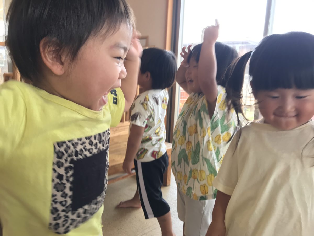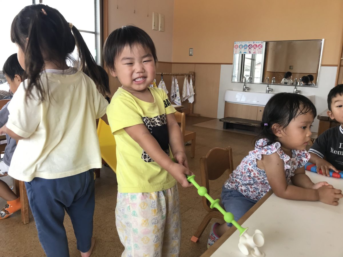 今日は絵本の“おおきなかぶ”ごっこをして大盛り上がりの子ども達。吸盤の玩具を大きなカブに見立てて「うんとこしょ、どっこいしょ!」と言いながら、スポンっと音を立てて吸盤が外れると、「やったー!」「きゃあ~!」と大喜び!みんなで一緒に抜こうとしていたので、大歓声で楽しそうに何度も“おおきなかぶ”ごっこをしておりました。「おばあさんはつかれてるから、つかれたね。」と絵本のおばあさんの疲れた様子が絵で描いてあるのを見て、自分も疲れた事を話していて、会話がとても面白いなと見ていて笑えてきました。