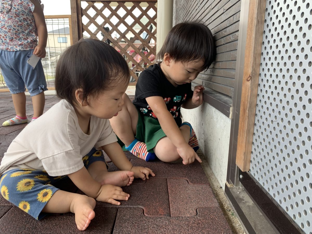 「あ!あり!」と指さしをしながらアリを確認!その声に気になったいちご組のお友だちもアリを目で追って見てました。