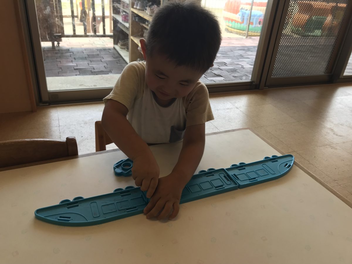 平面で新幹線作り。どうしたらくっつくのかを触って見たり、真ん中につなぎの部品を入れてみたりしてました。