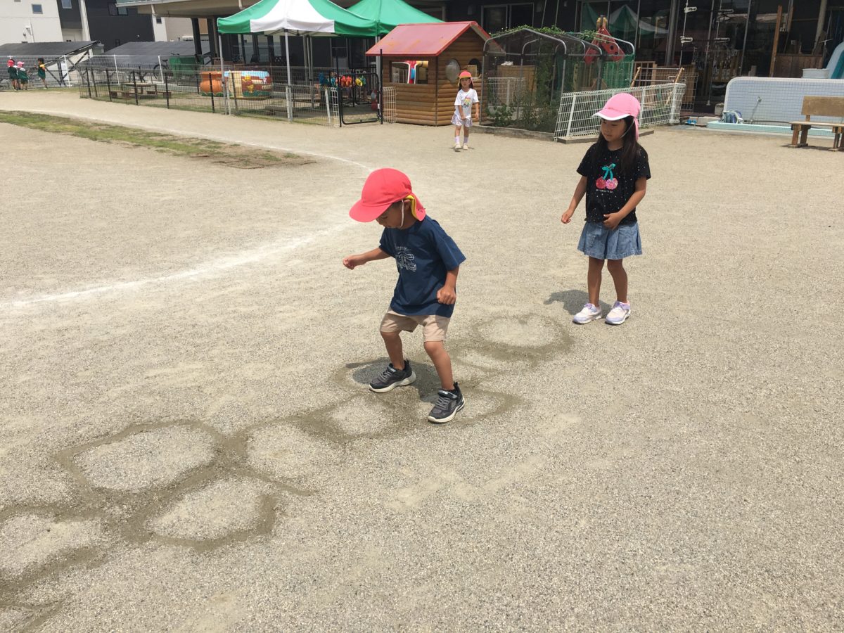 ケンケンパ!ケンケンパ!リズムよく進めるかな~? 出だしは上手くいくのですが、途中で片足が両足になってしまい、「あははーむずかし!」と言いながら楽しそうに進む子どもたち。