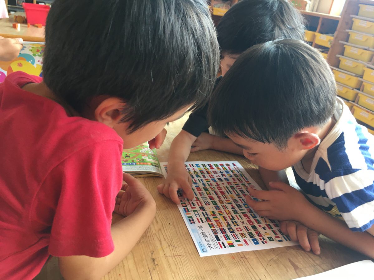オリンピックの話で盛り上がる子どもたち。その後に掲示板に貼ってあった国旗を見ながら「もっといろんなくにの、こっきがしりたい!」と話す様子もあり、準備すると「これが、スウェーデン。こっちがスイス!」とどんどん知っている国を言っていくめろん組さん。
