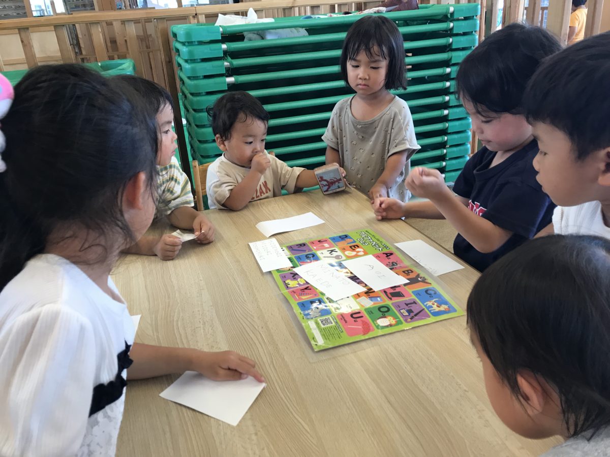 また、お部屋では、アルファベット表を見て自分の名前のアルファベットを見付けようとしたり「何個あるのかな」と数をかぞえたり、紙に書き移して「できた!」と保育者に見せて書けた事を喜んでいました。いちご組、りんご組のお友だちはお兄さんたちがアルファベットを書いている姿を興味を持って見ていました。